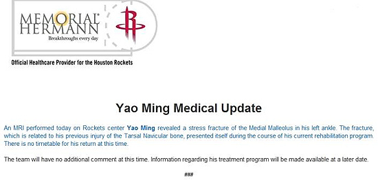 中新網12月17日電 北京時間今日,火箭官方向媒體發放的新聞稿中表示:中鋒姚明日前接受了核磁共振檢查,但結果顯示其左腳踝再次出現應力性骨折,回歸賽場仍舊遙遙無期。隨后火箭媒體《休斯頓紀事報》專家更撰文質疑,稱昔日的聯盟最佳中鋒或許就將因此告別職業生涯。