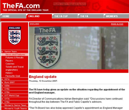 英格蘭足總新聞發(fā)言人貝溫頓表示,“英足總和卡佩羅的顧問已經(jīng)就執(zhí)教問題持續(xù)討論了一天。足總董事會(huì)今天已經(jīng)認(rèn)可了對于卡佩羅的任命。不過雙方還要繼續(xù)進(jìn)行合同方面的協(xié)商,這些工作將在明天繼續(xù)進(jìn)行。”