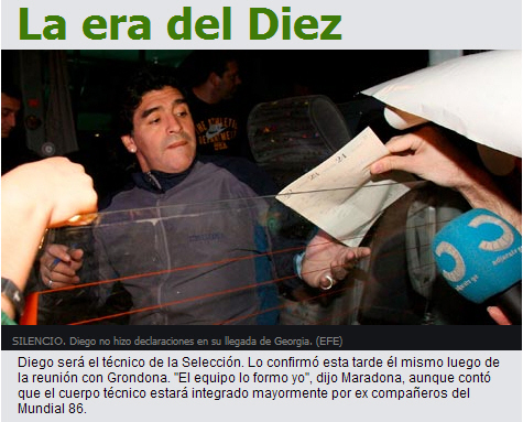 《奧萊報》以“10號的時代”為標題,第一時間發表了這條消息。阿根廷時間10月28日下午,馬拉多納在和格隆多納面談后確定了自己將成為新的國家隊主教練。他說:“我將自己組建球隊。”同時他還表示,教練組將以他86年世界杯奪冠時的球隊成員為主,甚至當時的冠軍主帥比拉爾多也有可能再度出山,輔佐愛徒。