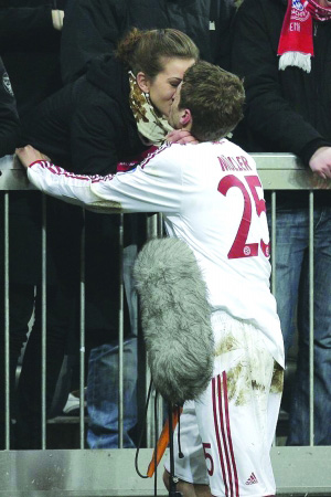 這位在租借而來的前鋒多諾萬回到美國大聯盟之后才得到出場機會的小將,在昨晨比賽的第72分鐘登場,這也是他在歐冠聯賽中的處子秀,然而17分鐘過后,他就在一次角球混戰中攻入了個人的歐冠聯賽處子球。進球后的穆勒顯得非常興奮,飛奔到看臺上女友所在的位置,而他的女友很默契地送上了浪漫一吻?吹竭@對恩愛的小情侶,現場所有觀眾都送出了自己的掌聲。