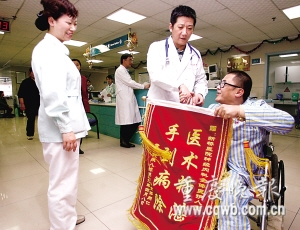 昨天,田曉偉特意將一面錦旗送給了主治醫(yī)生帥杰,以此方式對這位“球迷朋友”表達(dá)特別謝意。
