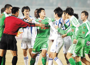 在補時了長達7分鐘后,主裁判阿卜杜拉終于吹響了終場結束的哨音,但裁判的3聲長哨卻變為“沖鋒號”,兩隊隊員再次糾纏到一起,最后北京警方不得不進入場內控制局面,才讓怒火中燒的兩隊球員返回各自休息室。