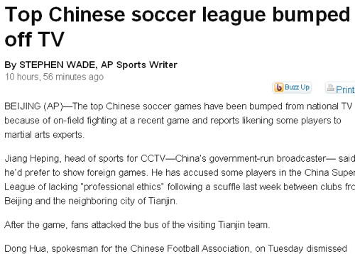 美聯社文章稱,中國足球的頂級聯賽已經被“踢出”國家電視臺的節目單,因為最近接連不斷的球場暴力,在媒體報道中甚至被稱作“武術選手”。文章援引了央視體育頻道總監江和平的說法稱,他更希望播出外國的體育節目。“最近中超聯賽非常混亂,有一些球員缺乏職業素質,”他指的是上周北京國安和天津泰達隊的比賽中,兩隊球員爆發了群毆事件,賽后一些球迷還襲擊了客場作戰的天津隊的大巴。