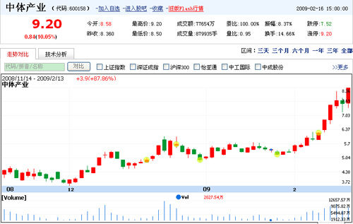 又漲停了!昨天(2月16日)下午,中體產(chǎn)業(yè)(600158)以9.20元漲停收盤,這已經(jīng)是該股近6各交易日以來第5次漲停,不少被套牢的股民終于解套,并稱是謝亞龍解放了他們。由于前中國(guó)足協(xié)專職副主席謝亞龍將于2月26日入主中體產(chǎn)業(yè)董事會(huì),因此筆者在中體產(chǎn)業(yè)股吧注意到,不少股民從一開始臭罵和惡搞謝亞龍,轉(zhuǎn)變成了感謝。