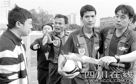 比賽開始后,雙方對抗異常激烈,球員屢屢倒地,但裁判的哨聲卻比較松。下半場,莫偉聰的哨聲越來越偏,多次判給南昌前場定位球,好在門將徐洋表現神勇,加上門柱再一次幫忙,川足頂住了最危險的一段時間。不過此時,最不可思議的一幕出現了,騰彬又一次被放倒,躺在地上沒起來,暫停了比賽的莫偉聰跑過來,和對方門將一起拉他起來,嘴里還喋喋不休。這時候,他突然又和一旁的周威理論起來,并出示了一張黃牌。下場后,周威向記者描述了當時的情形——原來,莫偉聰在騰彬起身后,竟自言自語地罵道:“這幫傻X,就會假摔。”不料被周威聽見,質問他為何罵人,莫偉聰爭辯了幾句,掏出黃牌。