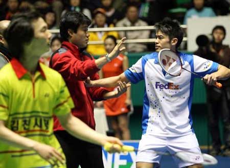 昨天結束的韓國羽毛球公開賽傳出了不和諧的聲音,中國隊男單頭號種子林丹在決賽中以1比2不敵東道主選手李鉉一,林丹險些與李鉉一的教練、前中國男隊主帥李矛動武。他憤怒地把手中的拍子砸向李矛,兩人幾乎要打架,幸虧旁人將他們分開。另外,中國隊丟掉了女單冠軍,小將盧蘭在決賽中不敵代表中國香港隊的前中國隊主力周蜜。