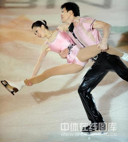 2009年2月25日,為答謝觀眾,獲得第24屆世界大學生冬季運動會花樣滑比賽前三名的選手,在哈爾濱國際會展中心體育館進行表演。圖為獲得雙人滑冠軍的中國選手張丹/張昊激情演出。(中體在線圖片 白宇 攝)