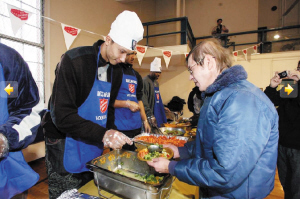 昨天,易建聯(左圖左一)和卡特、哈里斯等籃網隊員一起來到新澤西的一家教堂,在感恩節到來之際,向當地社區貧困居民分發食品。在活動現場,易建聯身著便裝頭戴一頂繡有籃網標志的廚師帽發放食物,整個活動過程中易建聯始終面帶微笑,并和獲贈食物的居民親切交談。