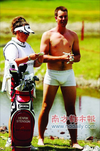 日前,高爾夫WGC-CA錦標(biāo)賽首輪,瑞典高爾夫名將亨利克·斯滕森脫光衣服救球的“壯舉”無疑是賽場上最吸引眼球的風(fēng)景。當(dāng)日在第3洞4桿洞,斯滕森直接將球開進(jìn)了球道旁的淤泥中,瑞典人一不做二不休,索性脫掉衣服鞋襪,僅剩一條內(nèi)褲徑直走進(jìn)泥里,引起場邊觀眾一陣騷動,斯滕森不負(fù)眾望,這一洞一舉吞下一個柏忌,最終以69桿排名第17位。