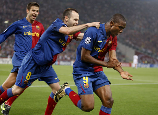 比賽第10分鐘,伊涅斯塔中路帶球突破塞到禁區(qū)右側(cè),埃托奧巧妙扣過維迪奇,隨即搶在卡里克補(bǔ)防前,在門前7米處右腳尖捅射被范德薩單手一撲還是滾入近角,1比0!