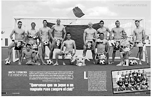 目前西乙FUERTEVENTURA俱樂部的球員們已經(jīng)數(shù)月沒有領(lǐng)到工資,雖然西班牙球員大聯(lián)盟介入了這起勞資糾紛,但是球員們最后得到的回復(fù)是可能兩年后才能領(lǐng)到被欠的薪水。于是,憤怒的球員拍攝了一組裸體圖片,并手持阿布等富商的照片,就是希望某個阿拉伯王子或者阿布能前來收購俱樂部。