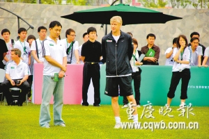 昨天北京氣溫驟降,下起了大雨。一直到中午,大雨才停。下午兩點半,50歲的溫格準時出現在球場邊,雖然天氣偏冷,但仍然穿著短褲運動衫,顯示了一位職業教練的素養。在對這支中學生希望隊進行20米T字跑、彈跳等基本測試后,溫格選出了10名隊員分成兩組進行15分鐘的對抗賽。在觀看這些未來之星的表現時,溫格像在英超執教一樣認真,并給了隊員們適當的建議。