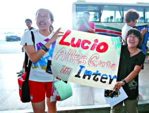現場還有兩位女球迷顯得非常安靜,她們手上的自制海報寫著“Lucio Alles Gute in Inter(盧西奧,在國米一切順利)”,還高舉著拜仁的球衣,當盧西奧現身時,其中一位女球迷狂叫著“盧西奧”的名字,飛奔至國米大巴邊,被兩位保安攔下。