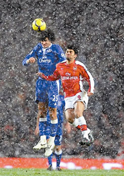 英超第21輪在雪中激戰,圖為阿森納球員席爾瓦(紅)與埃弗頓的費萊尼爭頂頭球。