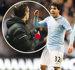 昨天,英格蘭聯賽杯半決賽首回合進行了一場曼徹斯特同城德比,結果曼城在第17分鐘就先被對方隊長吉格斯率先破門的不利形勢下,憑借前曼聯舊將、阿根廷國腳前鋒特維斯在第40分鐘的點球、第65分鐘的頭球,最終在主場以2:1險勝曼聯。值得關注的是,綽號“野獸”的特維斯此番面對“拋棄”他的老東家紅魔曼聯首度進球,而且還是梅開二度。不過,反咬紅魔快意復仇的“野獸”在進球后帶有挑釁、示威意味的張狂慶祝動作,卻引發了一場鬧劇。