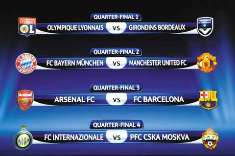 歐冠1/4決賽和半決賽對陣形勢昨晚在瑞士尼翁揭曉,上半區是拜仁慕尼黑對曼聯、里昂對波爾多,下半區是阿森納對巴塞羅那、國際米蘭對莫斯科中央陸軍,“重逢”成為本次抽簽的主題。由英超球隊包辦半決賽3個席位的乏味場面本賽季絕不會出現了,本賽季8強來自6個國家的聯賽。