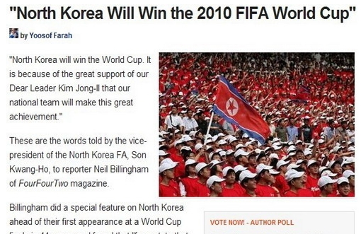 在此前的熱身賽中球隊2-2戰(zhàn)平前歐洲冠軍希臘,這場平局極大刺激了朝鮮人的信心。在談到為何認(rèn)為球隊能夠奪冠時,孫光浩態(tài)度十分堅定:“本屆世界杯朝鮮將會奪冠,因為我們有親愛的領(lǐng)袖金正日的巨大支持。這將會帶領(lǐng)我們達(dá)到最后的目標(biāo)!”