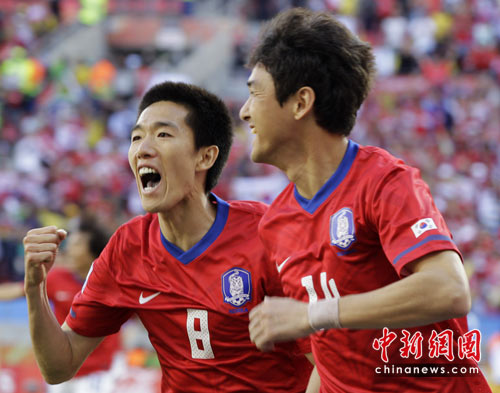 中新網6月12日電 北京時間19點30分,南非世界杯B組小組賽拉開戰幕,由“太極虎”韓國隊迎戰歐洲勁旅希臘隊。第7分鐘韓國隊由李正秀先拔頭籌,下半場開場后樸智星利用對方后衛的一次失誤將全場比分鎖定為2-0。