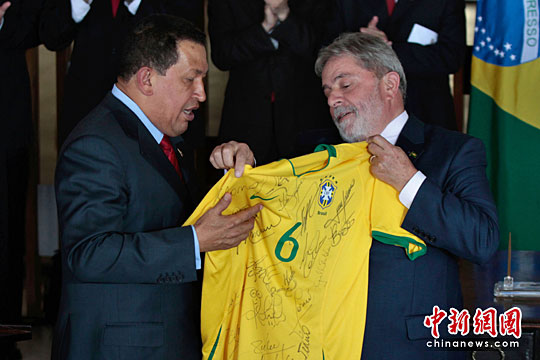 發展中五國領導人集體會晤2009年7月8日在意大利拉奎拉舉行。會后,代表中國國家主席胡錦濤出席會議的國務委員戴秉國與其他國家領導人一起會見記者。巴西總統盧拉在記者會上送給其他幾位領導人和代表有巴西足球運動員簽名的T恤。 中新社發 張朔 攝