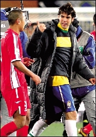 賽前大屏幕用視頻方式公布各隊首發(fā)名單,卡卡出現(xiàn)時,引發(fā)了全場最響亮掌聲和尖叫聲。當卡卡踏上球場,球迷的呼喊聲也是最大的。但比賽中的卡卡讓球迷失望了。卡卡每次拿球身邊總會有3名球員包夾。帶球被搶斷、傳球不到位、多次被撞翻,甚至帶球急停時摔跤。很顯然,卡卡的身體狀態(tài)非常糟糕。第80分鐘,卡卡被換下。賽后,心煩的卡卡甚至拒絕了鄭大世交換球衣的要求。