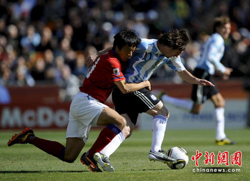 中新網(wǎng)6月17日電 北京時(shí)間今晚19點(diǎn)30分,2010年南非世界杯B組第二輪的首場(chǎng)比賽打響,由兩屆世界杯冠軍得主阿根廷隊(duì)迎戰(zhàn)亞洲“太極虎”韓國(guó)隊(duì)。16分鐘韓國(guó)隊(duì)前鋒樸周永不慎打入本屆世界杯的第二記烏龍;33分鐘阿根廷再獲得定位球,伊瓜因門前頭槌建功,2-0;上半場(chǎng)補(bǔ)時(shí)階段韓國(guó)隊(duì)由李青龍扳回1球,但下半場(chǎng)伊瓜因連入2球,上演本屆世界杯的第一個(gè)帽子戲法,助阿根廷4-1鎖定勝局,提前小組出線。