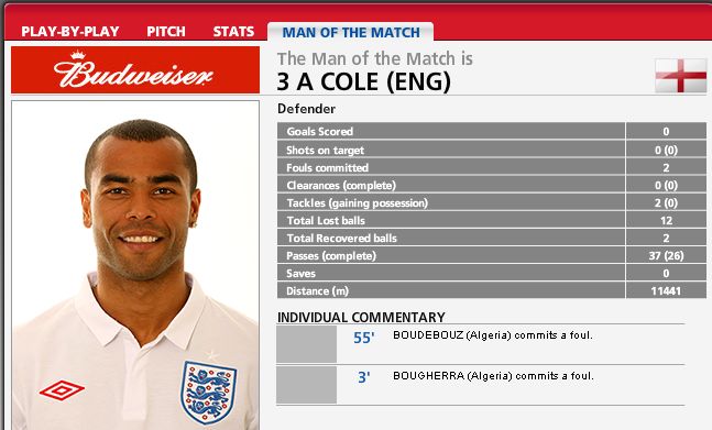 中新網(wǎng)6月19日電 在今天凌晨結(jié)束的一場世界杯小組賽中,英格蘭隊(duì)邊后衛(wèi)阿什利·科爾被評為全場最佳球員。不過從賽后國際足聯(lián)公布的技術(shù)統(tǒng)計(jì)來看,這位“全場最佳”的數(shù)據(jù)可以用“慘不忍睹”來形容。
