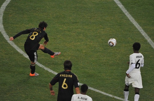 德國隊的控球時間高于對手,但是前鋒的把握機會能力差強人意。16分鐘,波多爾斯基抽射打空。加納隊的控球能力也很強,隊員們技術比較出色,反擊十分犀利。第25分鐘,德國隊獲得了開場以來最好的機會,厄齊爾拿球后單刀直入,但是面對對方門將金森,竟然將球射到對方身上,皮球被擋出。加納隊隨后也發動進攻,阿尤角球開到前點,吉安高高躍起頭球攻門,門將撲救不及,但幸好門前的拉姆護門成功,在球門線上用身體將球擋出。