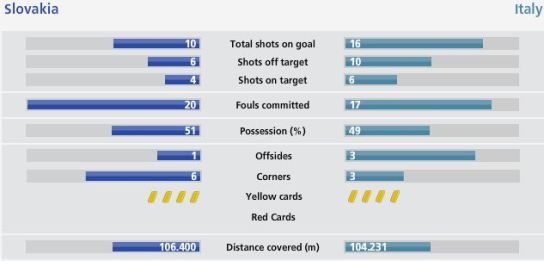 意大利隊全場越位3次,其中包括一個進球被吹無效。斯洛伐克隊只有一次越位。跑動方面,斯洛伐克隊也超過意大利,勤能補拙,最終掀翻對手晉級16強。