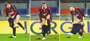不知是不是太過賣力,動作幅度太大,貝克漢姆的球褲在比賽中竟然撕裂了。向裁判申請后,米蘭隊工作人員將新球褲遞了上來,場上的萬人迷直接站在草地上,一把扯下身上的球褲,扔在地上,再將新球褲穿了上去。整個動作連貫流暢,沒有一絲猶豫,不過在他彎腰的時候,全場觀眾仍然看到了他的黑色緊身內褲下屁股的線條,這遠遠比貝克漢姆的腳法更容易讓女球迷激動。