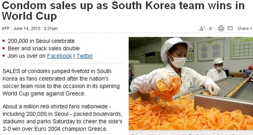 中新網(wǎng)6月15日電 在12日南非世界杯B組首輪小組賽中,韓國(guó)2比0擊敗希臘,而這場(chǎng)比賽的慶祝熱潮一直延續(xù)到了三天之后。據(jù)韓國(guó)媒體報(bào)道,韓國(guó)國(guó)內(nèi)避孕套的銷量大漲了將近五倍。