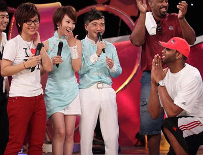這不,在他結束中國行之前,安徽衛視的一檔綜藝節目邀請麥迪和前超級女聲亞軍周筆暢一同參加節目,讓現場的觀眾大呼過癮。在節目現場,當得知眼前這個較小的女孩竟然是中國的一位頗具實力的歌唱新星時,麥迪想盡一切辦法希望能聽到周筆暢的歌聲,包括表演了各種籃球技巧。當然,為了回饋麥迪,周筆暢當場獻上一曲《I Believe I Can Fly》。對于美國球員來說,這首歌是再熟悉不過的了,因為它幾乎是為籃球飛人邁克爾·喬丹量身定制的。麥迪十分欣賞周筆暢的歌聲,而且一邊聽還一邊不停揮舞雙手,連連稱贊道:“她有一副好嗓子,我祝福她今后可以發展得更好!” 之后,與麥迪同行的友人更是抱起周筆暢的腰將她托起來灌籃。這一舉動讓周筆暢大感意外,對著歌迷說:“這可是我人生第一個大灌籃!” 。