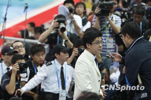 昨天東亞運的跳水比賽,當現場司儀介紹隊員名單時,霍啟剛起身走出貴賓室,來到看臺上的貴賓席。此時,記者乘機進了貴賓席,“潛伏”在霍啟剛的后一排,與他的距離不到30厘米。