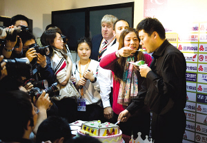 這時,丁俊暉媽媽拿起切好的蛋糕,親手給兒子喂了起來,不時還有人沖丁俊暉喊著:“小暉加油!小暉最棒!”此時賽場的緊張氣氛煙消云散,取而代之的則是溫馨與祝福,現場不時有記者感嘆,“場面太感人了”。在場的記者們也多了份口福,丁俊暉的生日蛋糕正好當成了記者們的“消夜”。