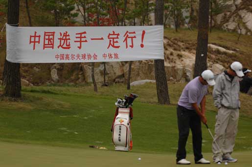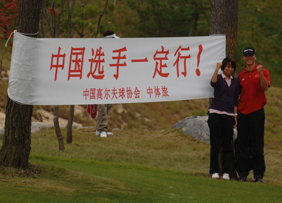 中新網首爾9月25日電 (張哉麟) 2009“韓國KEB銀行”中韓職業高爾夫球巡回賽韓國站比賽今日在韓國OSTAR高爾夫球俱樂部繼續進行,球場邊有橫幅上面用中文寫著“中國選手一定行!”,有工作人員還在這橫幅面前,與中國選手合影留念。