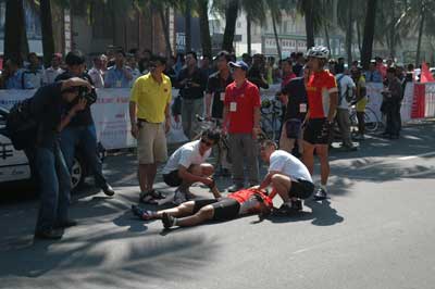 昨天,由海馬汽車(chē)贊助的2007環(huán)海南島國(guó)際公路自行車(chē)賽結(jié)束第三賽段爭(zhēng)奪,雖然本賽段比較平,難度不大,但卻意外發(fā)生中國(guó)隊(duì)選手惠國(guó)與攝影記者碰撞事件。記者昨天采訪了解到,惠國(guó)身體多處擦傷,退出比賽的可能性非常大。