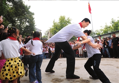 游戲開(kāi)始了,一位高年級(jí)同學(xué)當(dāng)老鷹,姚明則當(dāng)雞媽媽?zhuān)渌耐瑢W(xué)做小雞。姚明張開(kāi)雙臂,彎著身子,直視前方,掩護(hù)著正在身后休息的孩子們。不一會(huì)兒,兇猛的“老鷹”如猛虎出山似地飛過(guò)來(lái),用左晃晃、右看看,想要出擊卻找不到合適的機(jī)會(huì)。正當(dāng)大家有些松懈的時(shí)候,“老鷹”猛地一陣,展開(kāi)有力的翅膀向姚明身后的孩子們發(fā)動(dòng)了襲擊。姚明左顧右盼,進(jìn)行有力阻擋,但是一不留神,后面的孩子們突然掉隊(duì)。“老鷹”順勢(shì)活捉了離隊(duì)的孩子們。“快來(lái)救我!”聽(tīng)到孩子們的呼喊,姚明立即轉(zhuǎn)了方向,趕走身后的“老鷹”。場(chǎng)上玩的開(kāi)心,場(chǎng)下也看得開(kāi)心,加油聲、歡笑聲回蕩在小小的校園內(nèi)。兩個(gè)回合下來(lái),雖然有些疲倦,但是姚明和小孩們都還不盡興,再次回到場(chǎng)內(nèi)過(guò)把癮。當(dāng)裁判老師一聲哨響宣布結(jié)束時(shí),姚明才有些戀戀不舍地回到了座位。(徐楊 陶玲 彭晗)