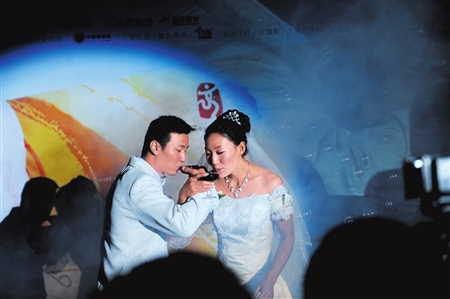 邛海水面上,八艘帆船來回穿梭。殷劍的小師弟、小師妹以特殊的方式,為自己的師姐助興。而在承辦婚禮的邛海賓館內,帆船的風帆成為最醒目的路標:一個箭頭標明了方向,一行小字寫著:“幸福的小船”。下午5點過,兩艘白色的小艇從不同方向慢慢駛向碼頭,新郎、新娘同時靠岸。率先上岸的新郎牽著新娘的手,慢慢走上游艇。雙雙放飛了象征愛情的信鴿。新郎、新娘在船頭完成了最深情的一吻。