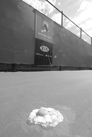 果然,昨天一大早,炙熱的陽光便烤得人們頭昏眼花,氣溫也很快躥升到40攝氏度以上,使得整個墨爾本像一個大火爐。據報道,墨爾本郊外的鐵軌在烈日暴曬下,部分已經變形,火車因此延誤。有記者在賽場中央試著打了個雞蛋,沒想到雞蛋竟被煎熟了。