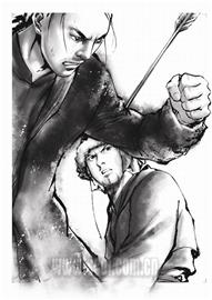 “電腦技術能很好地解決毛筆技法較難處理的地方”,光祖說,“而且電腦上色快,易修改,效率高 ,有問題可以馬上解決,便利性強。在決定用水墨技法以后,我們用了較長的一段時間去用電腦體現毛筆的感覺,剛開始的時候還遇到不少困難,還好到最后還是解決了!彼f:“所有的連載都是用毛筆作底稿,后期再用電腦去潤色,增強國畫效果。在創作初期,毛筆的底稿是必要的,漫畫所有的基調還是要一筆一劃畫出來,而后期的潤色,則用電腦,這樣互相配合,才能充分發揮兩者的優點嘛!