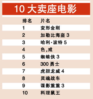 2007年臺灣地區(qū)10大賣座片熱辣出爐,不過仍是好萊塢電影的天下,《變形金剛》拔得頭籌,唯一上榜的華語片《色,戒》名列第4。相比較其他的華語片則票房慘淡,華語片賣座亞軍周董的《不能說的秘密》票房只有《色,戒》的五分之一。