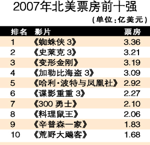 尚有數天便告別2007年,是時候為好萊塢電影發一張票房成績表。今年,《蜘蛛俠3》以3.36億美元(約合25億人民幣)成為北美最賣座電影。綜觀今年電影票房,仍然是特技片與動畫片的天下,由香港動畫師許誠毅執導《史萊克3》領跑動畫片,以3.21億美元排名第二。
