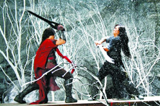 發布會當天拍攝的是聶風和步驚云的最后一場雪中決斗戲,這也是全片的一場重頭戲。在拍攝時還發生了一點“意外”,鄭伊健的劍不小心打到了郭富城的頭上,現場工作人員非常緊張,郭富城安慰大家說沒關系,沒流血,結果拍攝結束,郭富城摘掉假發后才發現,被打到的地方竟然腫得老大,郭富城打趣道:“腫得像乒乓球,就當迎接奧運了。”