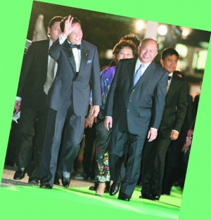 吳宇森、梁朝偉與日本首相(揮手者)共走星光大道。