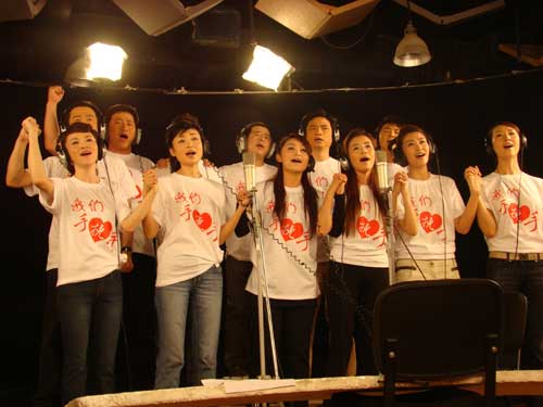 在將近10個小時的錄制過程中,所有參與的工作人員在將近五十度高溫的錄音棚內堅持工作,以最飽滿的熱情錄制歌曲。朱軍、董卿還都是在結束了白天的工作后在凌晨直接趕到錄音棚的,整個錄制過程到凌晨1點半才結束。大家都真心地希望通過這首歌曲能給災區(qū)人民帶去些許撫慰,能夠鼓勵大家攜起手來堅強面對,共渡難關。