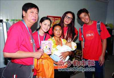 霍汶希:我記得地震的第一天她已經(jīng)打電話給我,說她想去,但是因?yàn)楫?dāng)時(shí)那邊太危險(xiǎn),義工機(jī)構(gòu)都不同意她去。這次她去是我們跟無國界的義工團(tuán)體聯(lián)系的,知道他們中秋節(jié)會過去陪那里的人過中秋節(jié),所以就安排阿嬌和一個(gè)女助手跟義工組織一起去了。