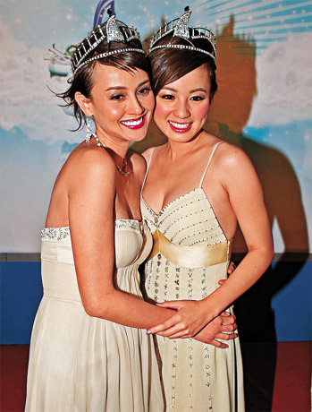 中新網(wǎng)12月8日電 前晚(6日)亞視舉行亞姐總決賽,大會(huì)邀請(qǐng)到85年至07年的部份歷屆亞姐撐場(chǎng),眾人身穿吊帶低胸現(xiàn)深溝,盡秀驕人身材。其中新婚陳煒?biāo)中匕肼叮咽莾膳傅氖讓脕喗愎谲娎柩嗌海簧淼托卮虬纾渖蟽r(jià)值1,200萬(wàn)元的鉆飾,風(fēng)頭最勁,而朱慧珊也戴上近千萬(wàn)首飾搶鏡。