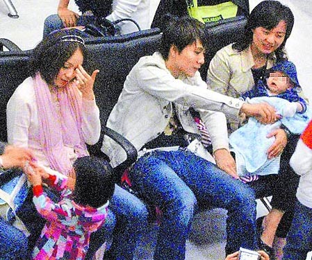 王仁甫(中)機場逗著哭鬧的兒子YaYa(右前),季芹(左)與女兒樂樂(左前)則陪在一旁。