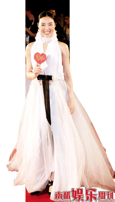 與去年張韶涵的泡泡袖蓬蓬裙如出一轍,愛心大使姜鴻波是撲克牌Q上的絕美圖案,不知出自于何人之手,一些雪紡紗可疑地堆在一起,腰部和領(lǐng)部下方鬼鬼祟祟露出了少少的身體,我們大膽地說:這叫時裝恐怖分子的留白。