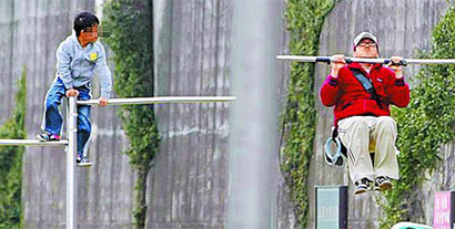 伊哈一家三口年初三到北海道團聚,之后悄悄返臺,據(jù)說這次碰面是解決家務(wù)事,昨下午記者目擊哈林帶哈利到大佳河濱公園,好動的哈利一下車就直沖單杠,掛在杠子上蕩來蕩去,身手矯捷。哈林不時比手畫腳指導哈利如何使力,還童心未泯走到較高的單杠前大手一拉,吃力地拉了3下。隨后哈林抱起哈利教他爬樹,父子親近大自然玩得忘我。