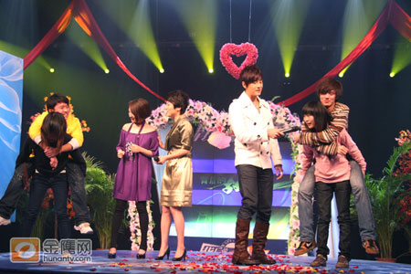 完美的“新娘抱”過后,粉絲的熱情只增無減,演播廳的大屏幕又很是適宜的播放鄭元暢、林依晨主演的偶像劇《我的愛情面包》中,鄭元暢橫抱林依晨參加耐力比拼游戲的片段。主持人張丹丹提議現場派出四名粉絲(兩男、兩女)上臺來玩“耐力大比拼”的游戲。搞怪的鄭元暢更是提議游戲中,由女生背男生進行游戲,增加比賽難度。